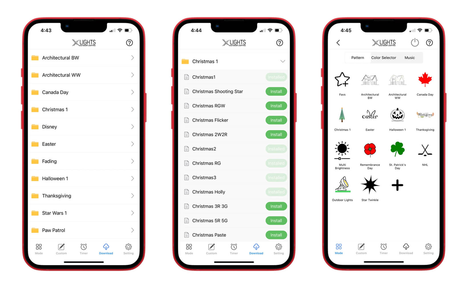 The X Lights LED App lets you instantly transform your outdoor and architectural lighting with downloadable pattern folders. These ready-made lighting effects are perfect for holidays, events, or everyday ambience — no manual programming required.Whether you’re illuminating soffits, pathways, decks, or façades, downloading patterns ensures your RGBW fixtures look professional and dynamic year-round.