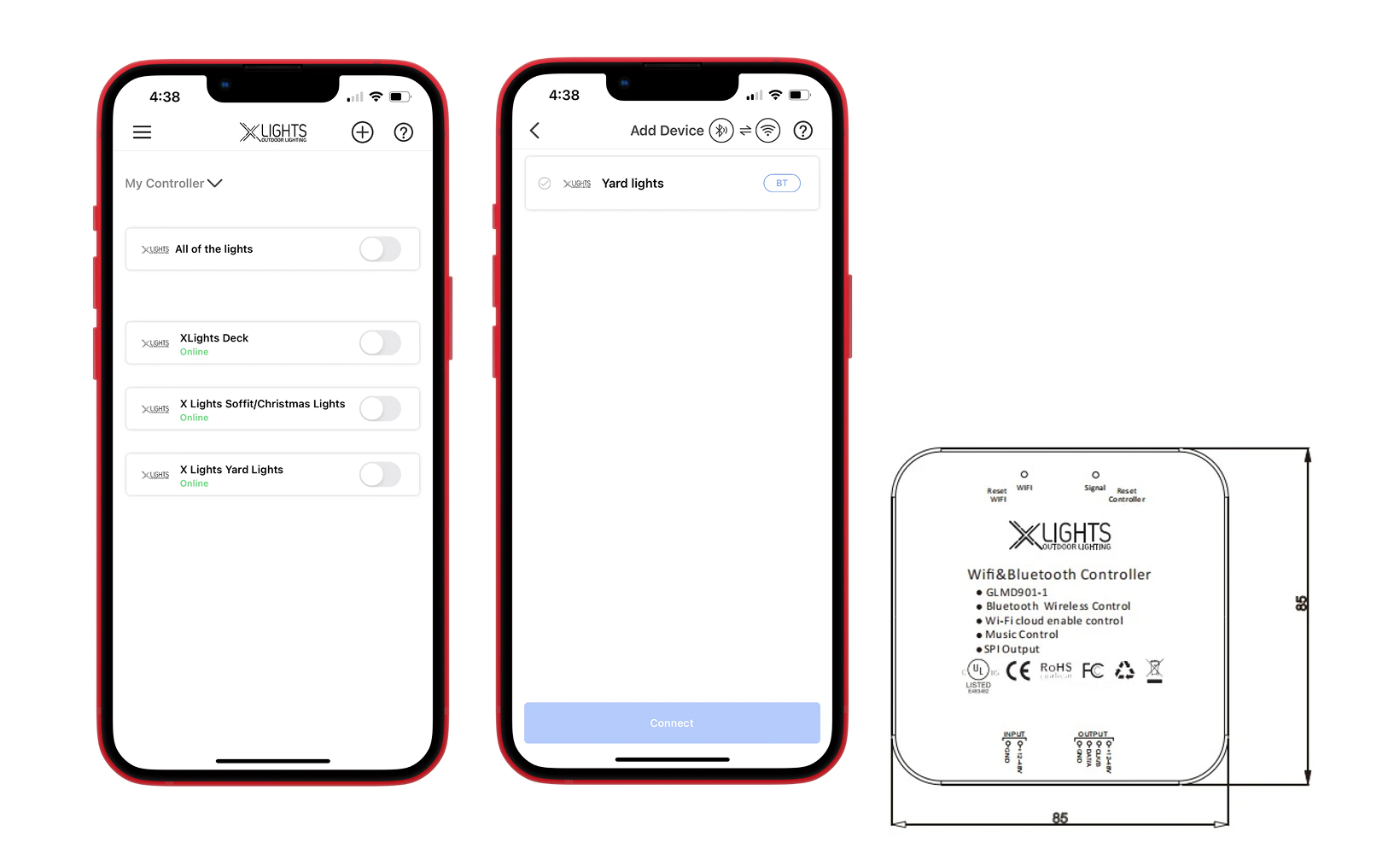 The X Lights controller connects through Wi-Fi or Bluetooth. Wi-Fi is recommended for daily use; Bluetooth acts as a backup for short-range control (within 10 metres).Connecting via Wi-Fi